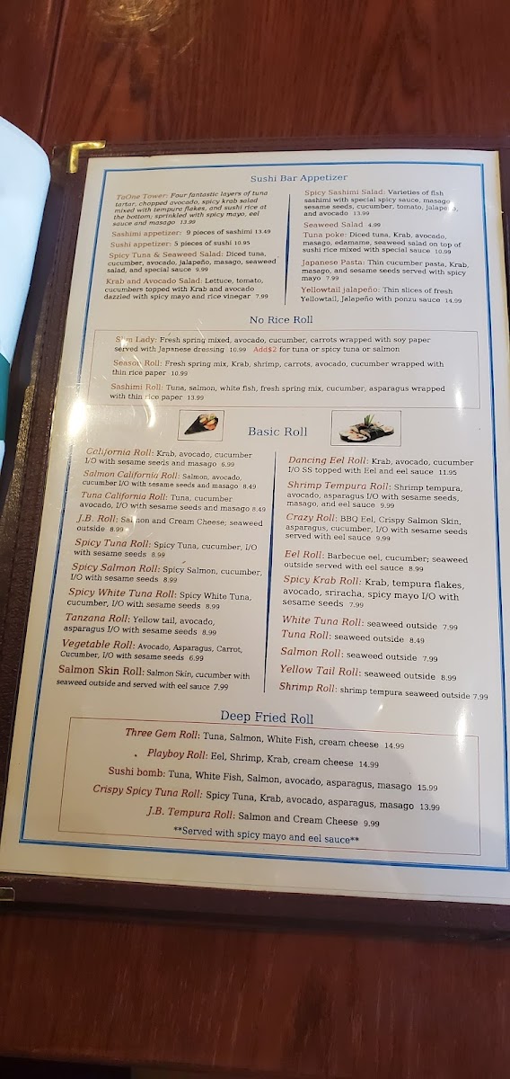 Volcano roll, dragon roll, spicy krab roll, spicy tuna roll, crunchy salmon roll, JB roll, and yellowtail jalapeno roll.
